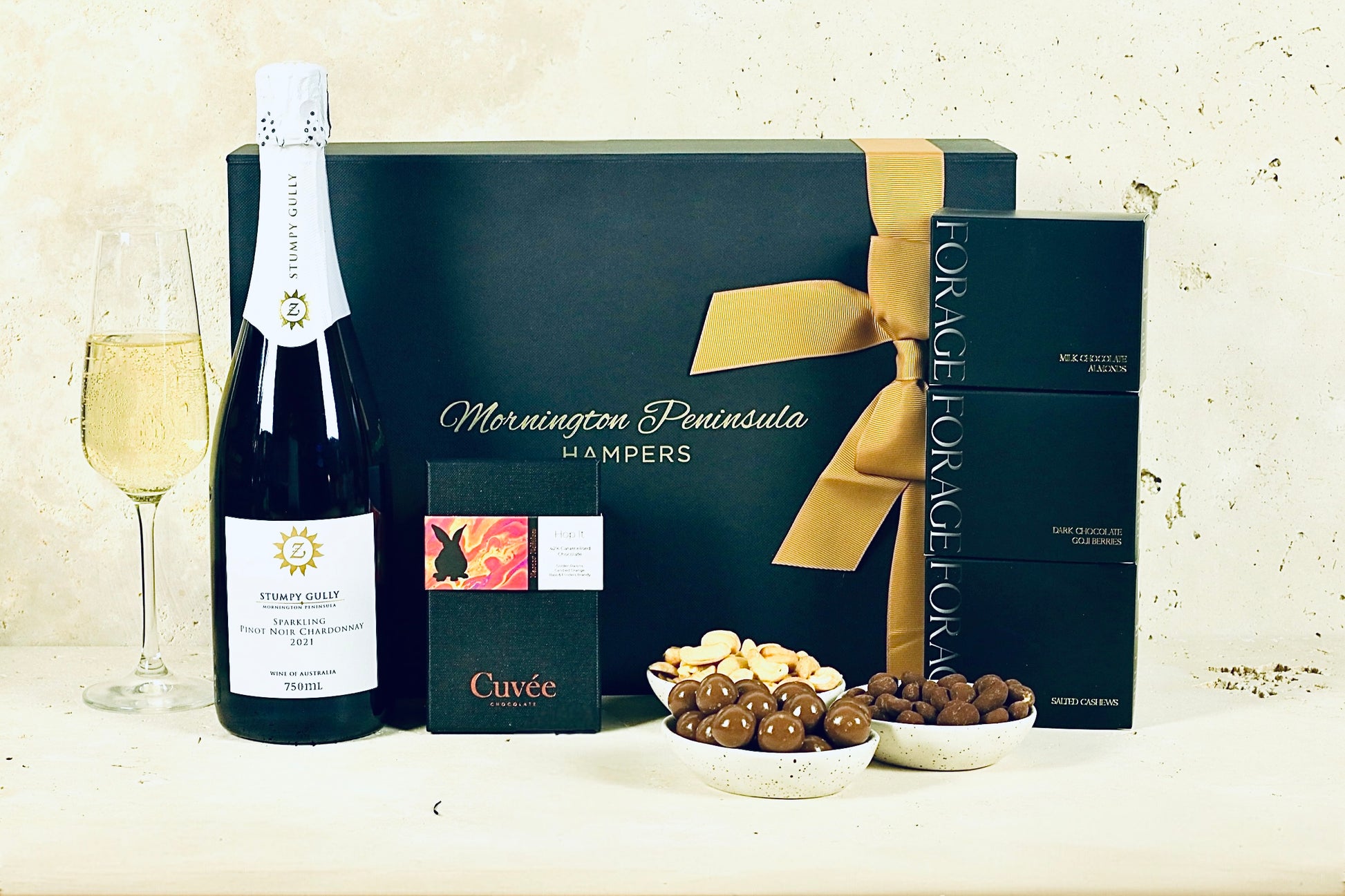 Choose between Stumpy Gully Pinot Noir or Sparkling and perfectly paired with Cuvee's “Hop It” Easter Chocolate - a decadent limited edition creation featuring golden raisins, house-made candied orange and Noble Stranger Brandy from Bass & Flinders Distillery - a rich, indulgent flavour combination and a creative take on the traditional hot cross bun.