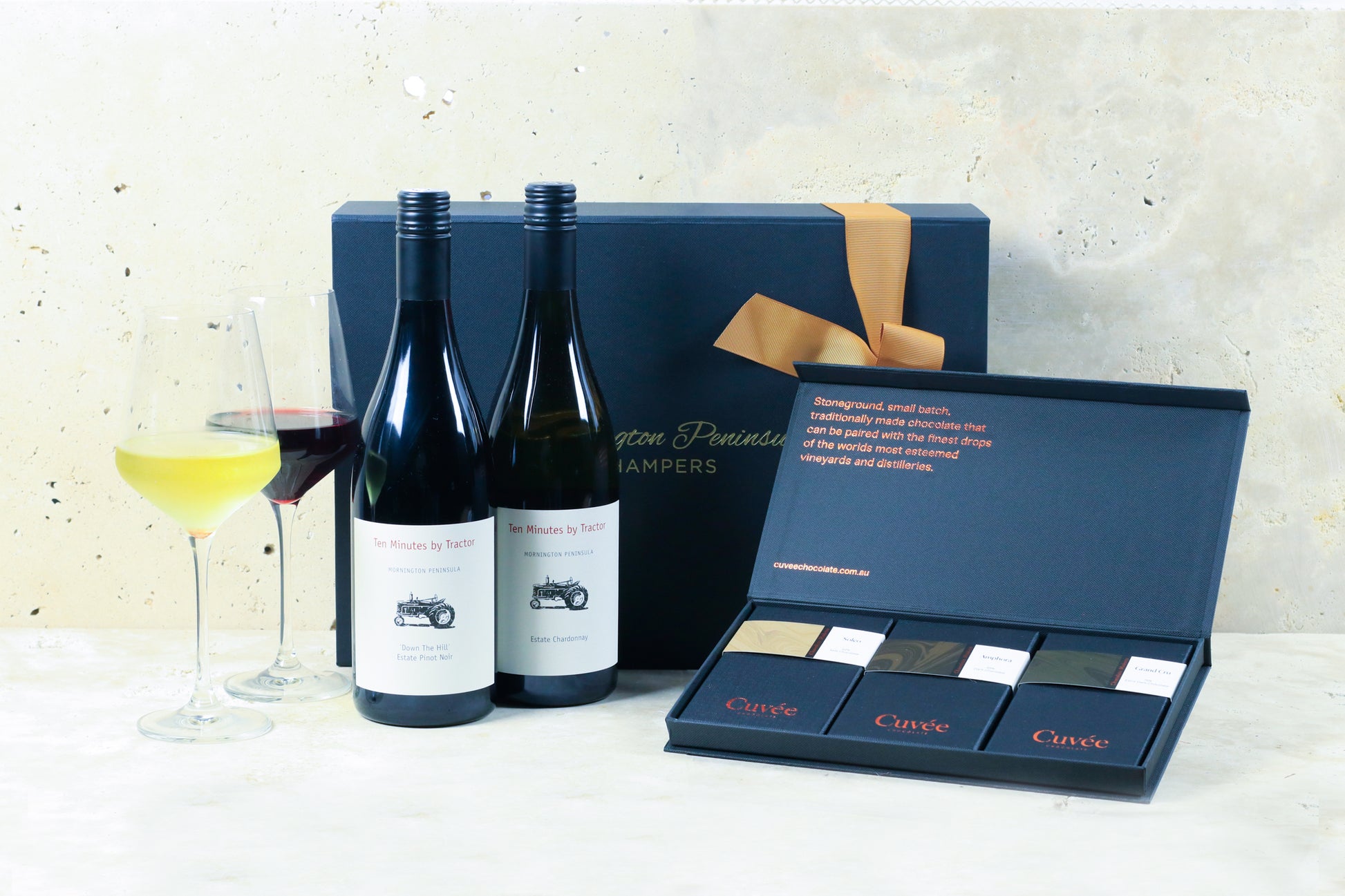 An exceptional pairing of some of the finest cool-climate Mornington Peninsula wines with elegant artisan chocolate, made for wine connoisseurs. This very special hamper has been curated to showcase the wine-making craftsmanship of the award winning Ten Minutes by Tractor, complemented by Australia’s finest bean-to-bar chocolate.